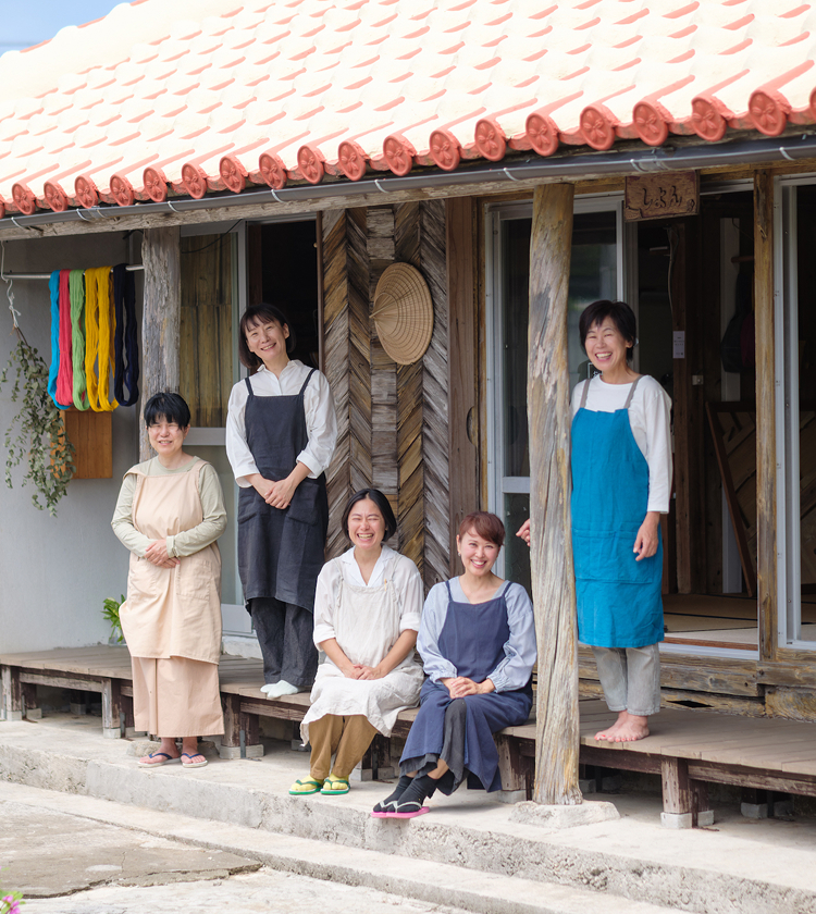 機織工房しよんでは、沖縄の伝統的な織技法をもちいて、つくり手自身が製品の企画・デザイン・染め・織りを行っています。