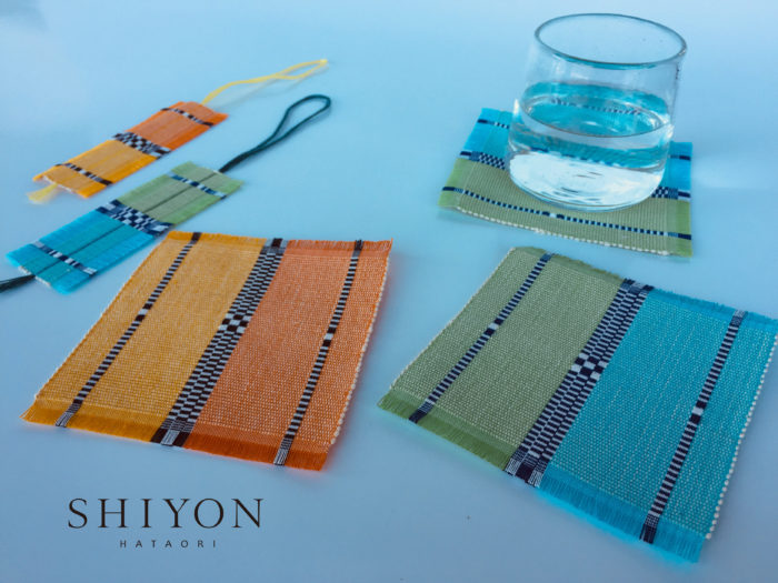 コースター Coaster 作り・約10分・¥1,200 (税込) しおり Bookmark 作り・約5分・¥600(税込)織り上がったらその場でお持ち帰り出来ます2019.4.27(土)-5.6(月)10:00-17:00 随時受付機織工房しよんにて 八重瀬町字仲座72TEL/FAX 098-996-1770mail@shiyon.info