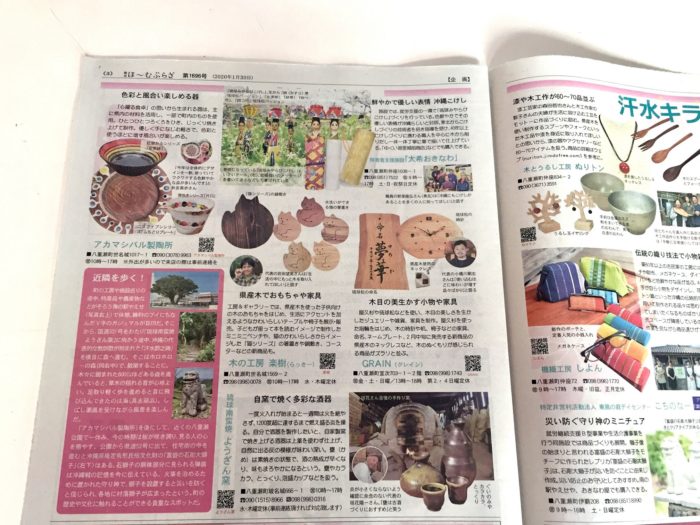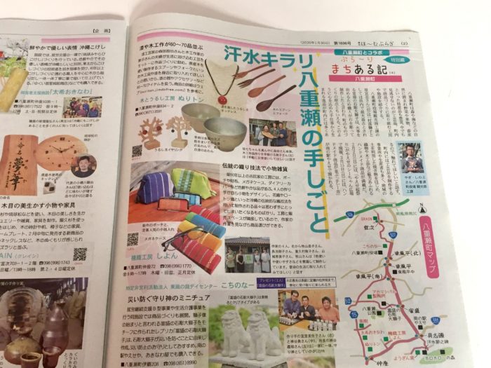 沖縄タイムス「週刊ほ~むぷらざ」の表紙&2・3面が八重瀬町特集に!八重瀬町のつくり手さん達の中に、機織工房しよんも載せていただきました。