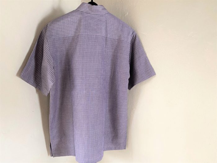 木綿のたて糸に少し節のある麻糸のよこ糸で織った、かりゆしウエアです。