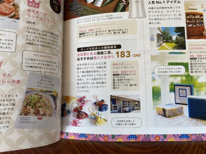 沖縄いいところ240コご紹介!『沖縄ランキング&まる得テクニック240』に掲載していただきました。240コ中の183番目に紹介いただいています。(P80)うすめで小さな雑誌なので持ち歩きに便利サイズです。お値段もお手頃っ