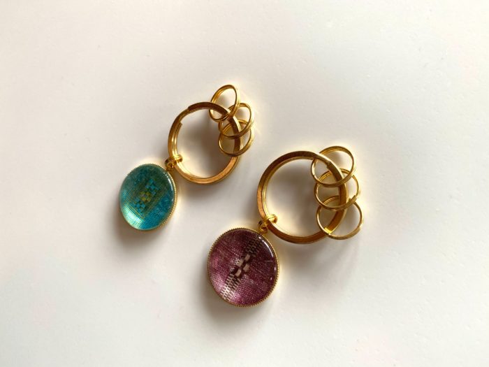 織技法:いろいろ素材:綿 強化ガラス加工 金属サイズ:Φ2.5㎝/L5㎝店頭税込価格:4,400山城恵美子 作