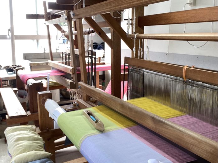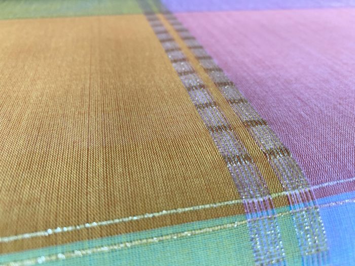 色のイメージやお母様のお好きなものをお聞きしてお花畑をテーマに織らせていただきました。金糸を入れてほしいとのご要望で、ロートン織部分にはさりげなく金糸がきらり。