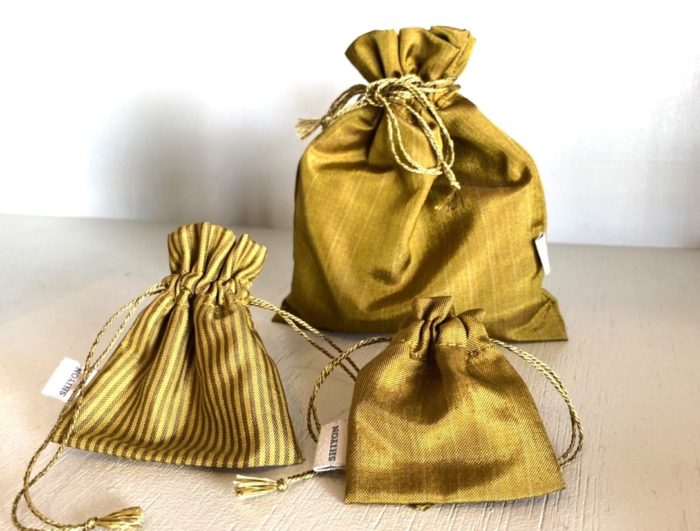 絹糸を福木の色で染めました。綺麗な黄色が絹糸の光沢と相まって黄金色に見えます。このしなやかな黄金色の巾着袋に大切なものをお納めください。