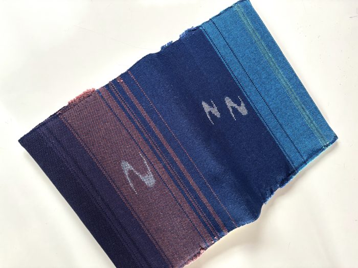 始めて見ると不思議に思うかもしれませんが、このはみ出す緯糸があることで本物の手結い絣(てゆいかすり)で織られたという証明でもあるのです。