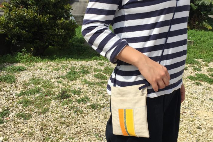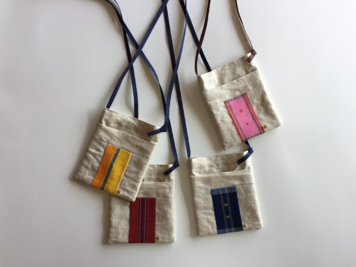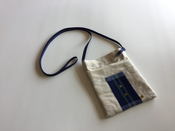 いろいろな服装に合うリネンとアクセントの手織り布で作りました。