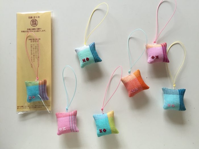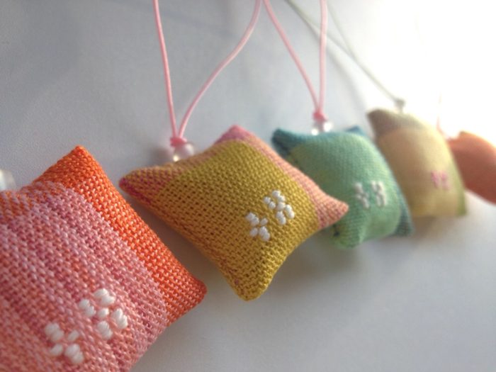 花織香り袋 織技法:花織 素材:綿 店頭税込価格:1,100円 サイズ: W3.5㎝/H3.5㎝/紐12cm 長池朋子 作
