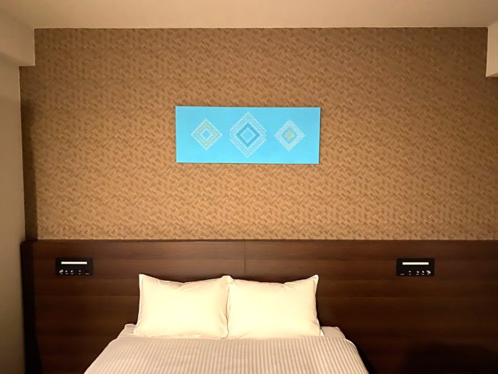 お部屋のパネルは織物は機織工房しよん作。紅型はべにきちさん作です。織り布パネルのお部屋に泊まれるといいですね(^^)/