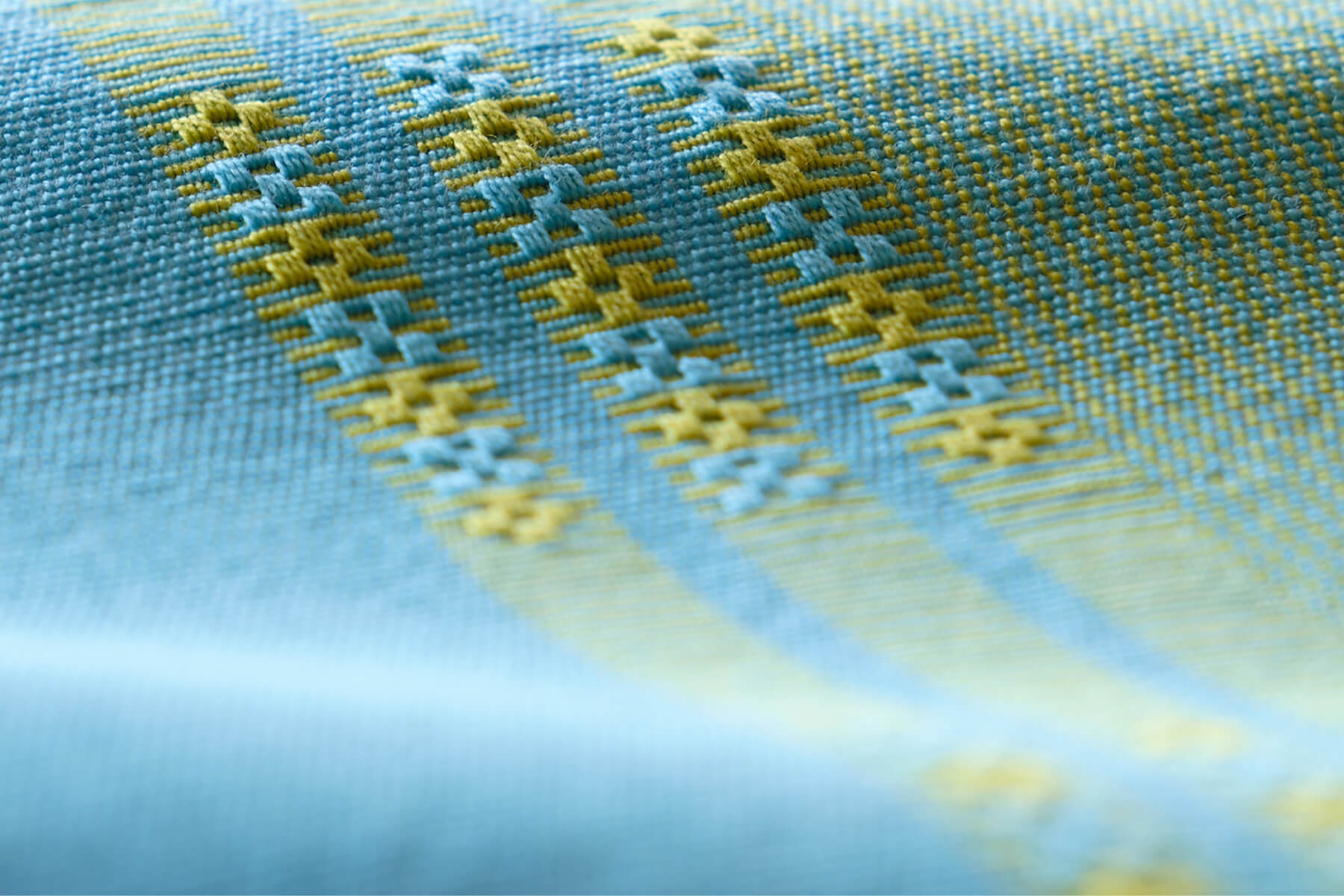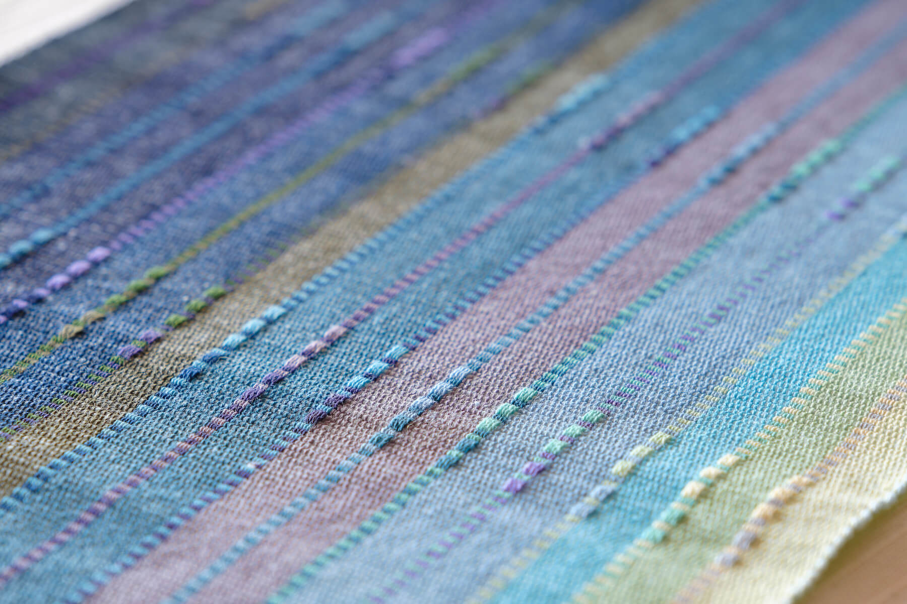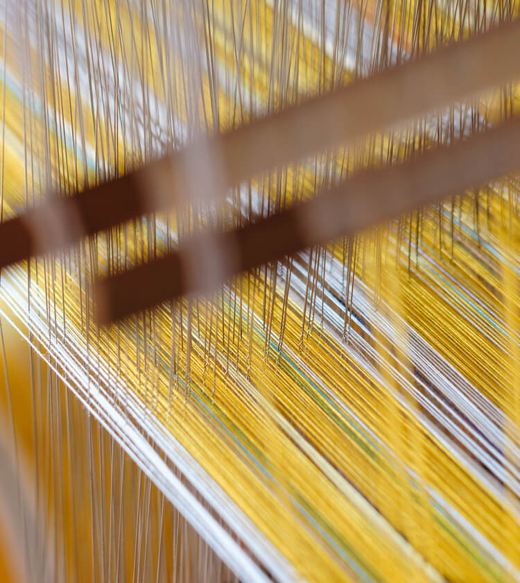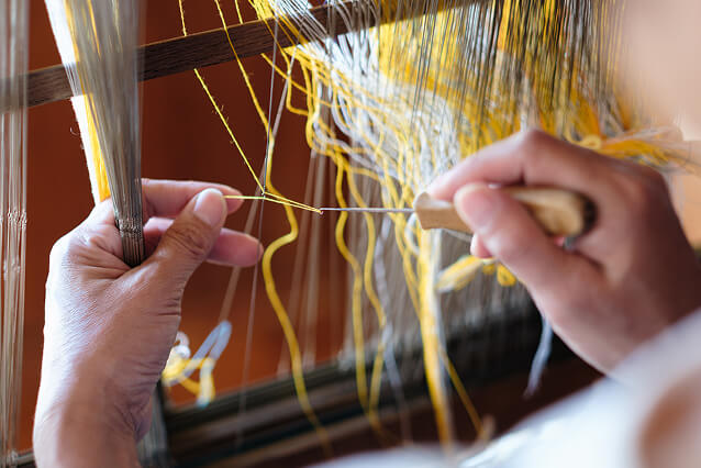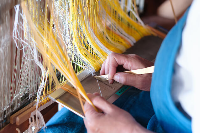手花織は手で緯糸を差し入れて紋様を織り出す技法である。「想いの手巾(ティサージ)」「祈りの手巾」として織られた。 *刺繍とは違い、織りながら模様をつくる。