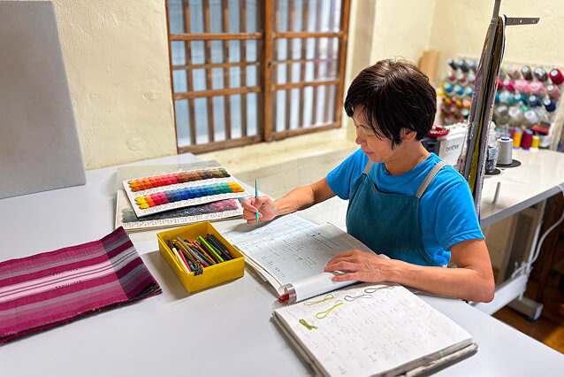 使う糸、色、織技法など、デザインはもちろん仕様について細かい設計をする。