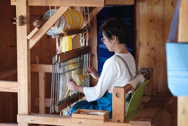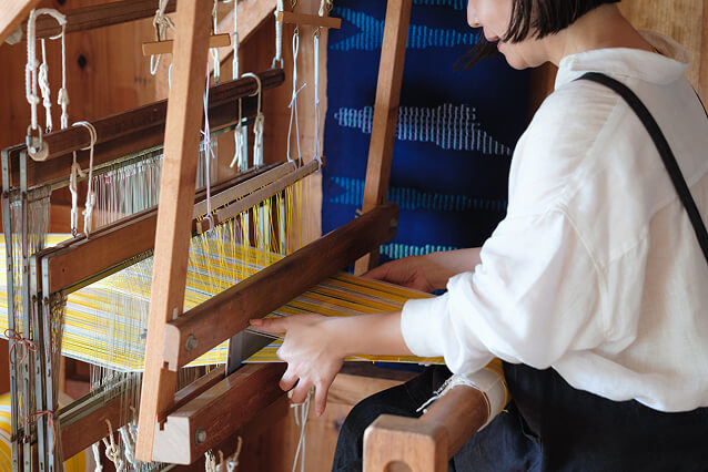 しよんの織物は、沖縄の織技法をもちいて、温故知新をモットーに手染め・手織りで制作しています。