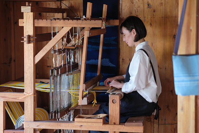 足元にある踏み木を踏み、経糸が開いたところに投げ杼でシャーっと緯糸を通し、「筬框(おさがまち)」を手前に引き、トントンと織っていく。「シャートントン」の機織りの音が、工房に響く。